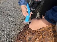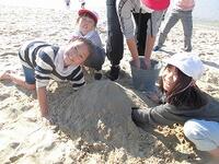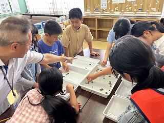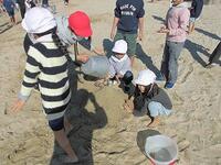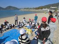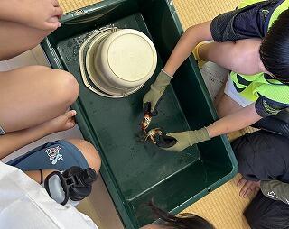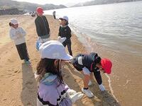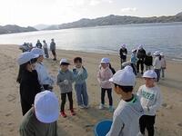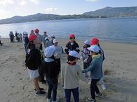 午後からさとうみ科学館の平山先生を講師に、グラウンド側の浜へ生き物調査に出かけました。みんな楽しそうに一生懸命生き物を採取していました。イシガニやオコゼ、エビなど採取していました。観察後、リリースしました。また、その後で、本日科学館に持ち込まれたカブトガニ2匹の放流も行いました。