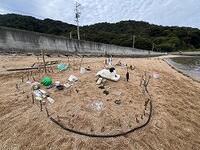 海のゴミを集めて作品を作りました。鑑賞した後は、分別して片付けました。海を自分たちの手できれいにしました。江田島の魚たちも住みよくなりますように。