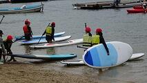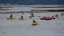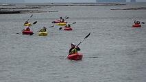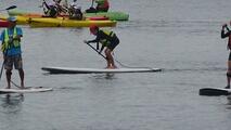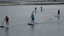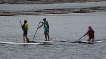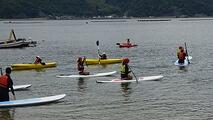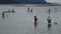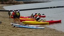 さとうみ学習の一環として、ビーチ長浜においてサップ、カヌー体験を行いました。はじめにビーチのごみ拾いをし、その後、はじめの会を行いました。次にサップとカヌーの2班に分かれて、それぞれ安全指導や器具の使い方などの諸注意を受け、活動を開始しました。サップは8人乗りと1人乗りがあり、途中で交代しました。